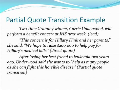 Examples of topics that might require the frequent use of quotations include: Here is an example of a partial quote taken from an article written by fischer: Using a partial quote allows journalists to emphasize specific parts of a speaker's statement that are most relevant to the story,. The point of a partial quote is to use quality paraphrase to set up a word, word pairing or short phrase to make a significant impact on.